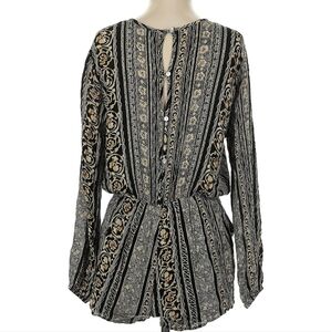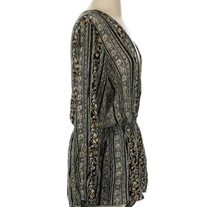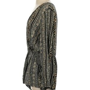 Stylish romper with intricate patterns. Features a deep V-neck and long sleeves.