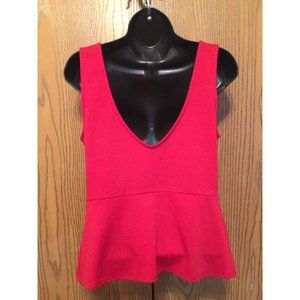 Women's size medium sleeveless top from Akira Chicago Red Label. The top has a scooped neckline and a V back. The front has gathering that gives a pleated look to the waist and from waist to the bottom. Solid red in color and made of polyester and spandex. There is a small black spot on the back of one of the straps, please see pictures.
