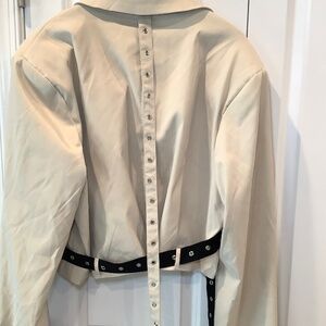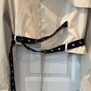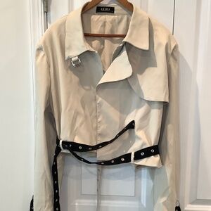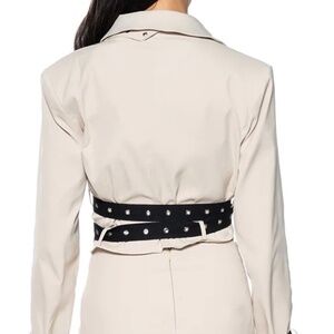 The AKIRA Label Linden Crop Trench Jacket is a unique take on the classic trench coat. Made from a sleek, structured base material, it features a fold over collar, storm flaps, long button cuff sleeves, a cropped cut, and an open front design. Complete with a smooth inner lining and belted strappy detailing. Style with the coordinating AKIRA Label Linden Trumpet Maxi Skirt for a complete look.