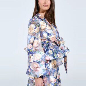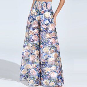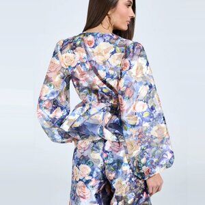 Akira Exalted Floral Palazzo Pant and Top Set is simply blooming with elegance. Chic bottoms are crafted from sheer mesh with a gorgeous floral print throughout. They feature a high-rise fit, a shirred elastic waistband, and an ultra-wide, flowy leg silhouette. Paired with the Exalted Brocade Tie Front Blouse.