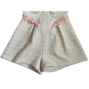 Gorgeous Pretty in Pink Tweed Romper from Akira. Women's size medium. Normal wear other than clasp above zipper missing as shown in photos. Small amount of piling. Approximate flat lay measurements are 16 inches pit to pit, 3 inch inseam, 22 inches length.