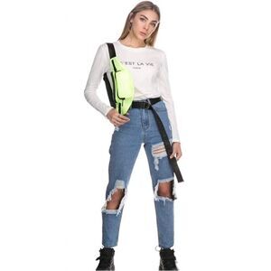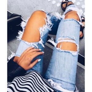 These Akira “mom” Jeans have been archived and are sold-out! A traditional high-waist blue Jean with strategically placed sexy rips along front and a small distressing on the back pocket. These do not have ANY stretch. They hug your curves so well I’ve never seen such a flattering jean! They also don’t create a gap above your butt in the back. Incredible design! All the measurements are in Pics (waist, hips, inseam and rise).