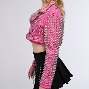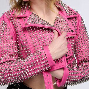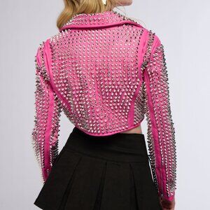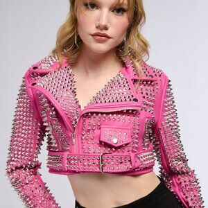 The AZALEA WANG The Gazette 3000 Stud Party Rock Moto Jacket features a hot pink faux leather fabrication, silver tone pointed stud details, a notched lapel, a front zip, zip front pockets, zips at the wrists, and an adjustable buckle at the waist. Style with light wash denim and PVC booties.