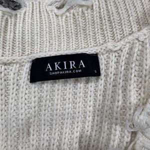 This is an Akira women's knit crop distressed sweater in size Small. The sweater is designed as a pullover style, featuring a knit fabric type in an ivory color. It is a regular fit and suitable for women. The distressed detailing adds a stylish touch to the overall look of the sweater.