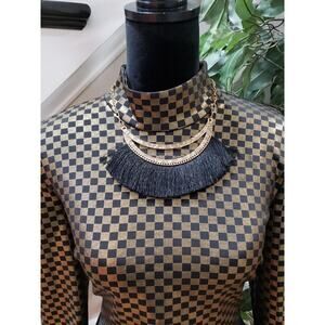 Akira Women's Gold Black Check Polyester Crop Back Zip Long Sleeve Top Blouse L