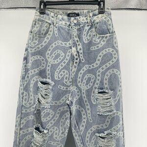 Akira jeans, distressed denim jeans, chain-print jeans, ripped jeans, edgy denim, streetwear jeans, high-waisted jeans, vintage wash jeans, grunge style jeans, statement denim, bold fashion jeans, relaxed fit jeans, trendy ripped denim, unique print jeans, Y2K fashion jeans, casual distressed jeans, women’s fashion jeans, cool graphic jeans, urban style jeans, statement ripped jeans.