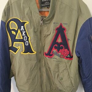 Akoo Bomber Letterman Varsity Jacket Mens Size Large American Flag Spellout