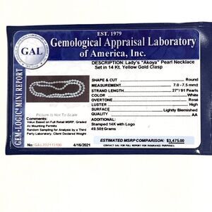 This Akoya pearl necklace has been Certified, Inspected, and Appraised by Gemological Appraisal Laboratory