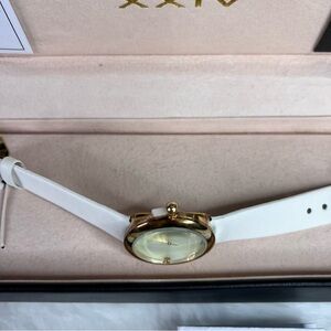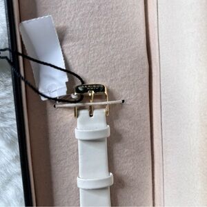 • Buckle closure on white satin strap