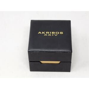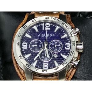This is an Akribos XXIV mens wristwatch. Watch is blue and silver with a brown leather band. The Watch has minor wear as pictured but is in excellent condition otherwise. Will need a battery.
