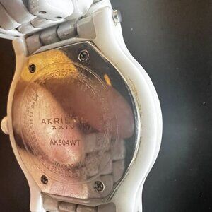 keywrods: women's watch, diamond watch, ceramic band, silver accents, luxury watch, analog watch, quartz movement, date display watch, elegant timepiece, water-resistant watch, Akribos XXIV, ladies' watch, original box