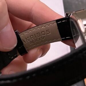 This is a gorgeous Akribos XXIV women's Skeleton black leather strap, automatic watch. It has either never been worn or only been worn a couple times. In order to set the time, you just pull out the side knob, and to set the time, you push it in. The watch currently retails for $435 on the Akribos website.
