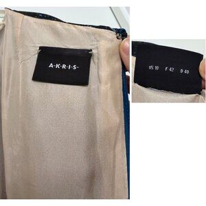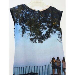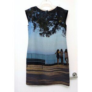 This Akris Bella Vista Print Shift Dress is in good condition. Features three women at a landscape overlook leaning on a guard rail print (blue sky water, tree, bench). Silk (no fabric tag), sleeveless, boatneck, hits above knee length. There are some faint marks and wear on the inside lining. Minor wear on the outside fabric. There is slight seam stretching on the zipper end.