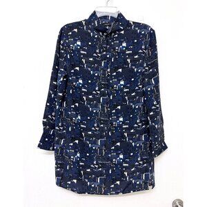 This Akris Chefchaouen Print Tunic Top is in great condition! This blouse features a navy blue buildings city print (geometric squares print). Silk, long sleeves, collared, partial button down shirt style. There are some marks on the edge of and inside the collar.