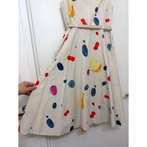 This Akris Fruit Print Shirt Dress is in great condition! Features a colorful, rainbow fruit dots print on a beige gray (greige) background. Inspired by Felice Lizzi Rix-Ueno. Cotton, sleeveless, collared, hits above knee length (has been shortened), button down shirt dress style, belted. Minor wear; some wrinkling on the collar/seams. There are some faint speck dots on the front waist and hip, and there is a small dot mark on the front hem. Snap buttons were added at the chest.