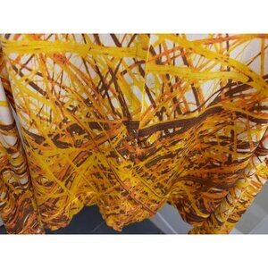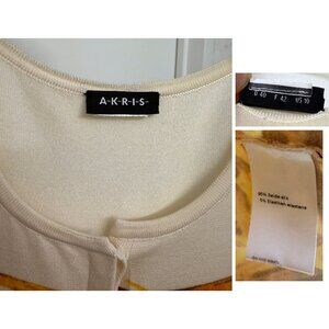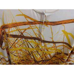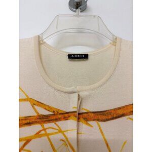 This Akris Grass Print Cardigan Sweater is in great condition! Features a yellow grass / straw / hay print on an ivory white background (like abstract stripes). Silk blend, long sleeves, round scoop neckline, button down on the front. There is a small, faint snag on one side. Minor pilling on a few areas.