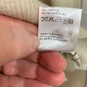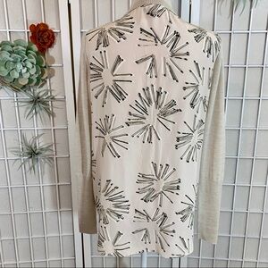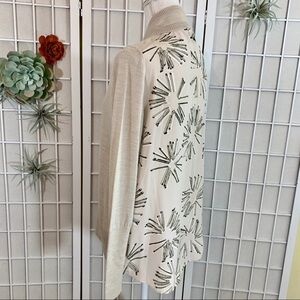 Gorgeous lightweight cream colored wool cardigan sweater-blouse in excellent condition. Sweater front and arms with tie neck. Silk matchstick patterned back panel. Retail is $595.