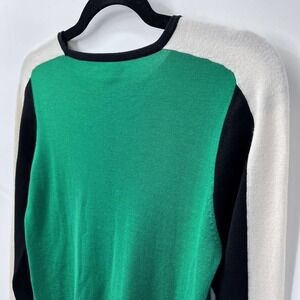 Stylish green sweater with navy sleeves. Soft and comfortable. Perfect for layering.
