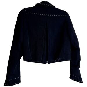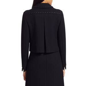 Akris Punto Grommet Cropped Jacket Women Size 4 Black 100% Wool Studded Long Sleeve Rocker Blazer Spread Collar Lower Flap Pockets Retail $1,390 Vented Cuffs Inverted Back Pleat Woven Finish Imported of Italian Fabric Luxury Made in Romania Designer Classic