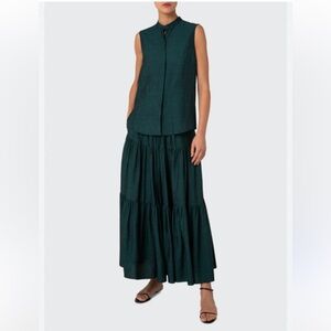 designer set, sleeveless blouse, tiered skirt, Akris Punto, modern elegance, rich teal, minimalist style, structured silhouette, high-end fashion, elevated basics, luxury set, work to weekend, capsule wardrobe, timeless design, European sizing, premium linen blend, polished look, sleeveless button top, refined textures, contemporary chic