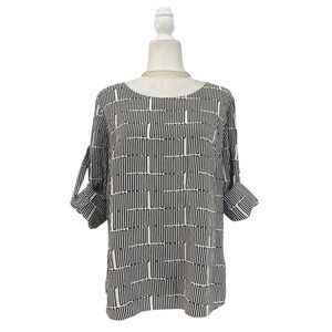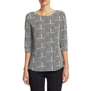 This luxe Italian silk blouse is finished with a modern optical print comprised of allover logo print of of AKRIS PUNTO spell out. Also features tab sleeve roll up option. Team it with tailored trousers or jeans for a polished modern casual look.
