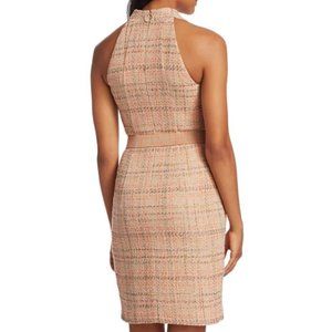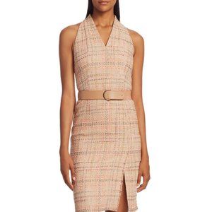 Designer well made dress in a deep purple almost merlot toned shade with allover dot print. Has a v-neck front with small front slit and racerback, zip up back. Sleeveless. I couldn't find the exact dress anywhere on a model photo but the tweed dress photos I included are the exact same silhouette so I included those as a reference for fit. VGUC.
