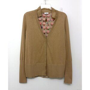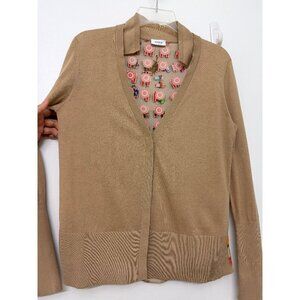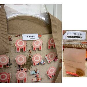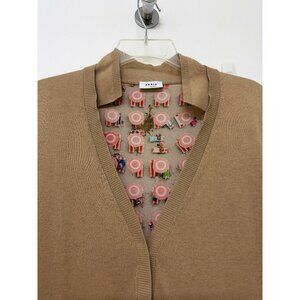This Akris Punto Riviera Cardigan Sweater is in great condition! Features a beach print with umbrellas / parasols (orange, tan sand, beige). Solid khaki beige in the front. Cotton front / Silk back, V Neck, long sleeves, button down cardigan style. There is minor pilling on the underarms. Minor wear throughout.