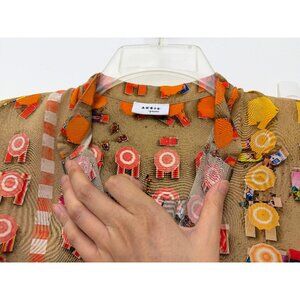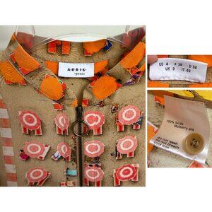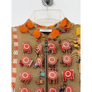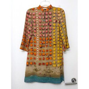 This Akris Punto Riviera Tunic Top is in great condition! Features a beach print with umbrellas / parasols (orange, tan sand, beige) with a blue ocean water border at the bottom. Silk, round neckline, tunic length, 3/4 length sleeves, half zip on the front. There is some fabric stretching on the back near the armholes.