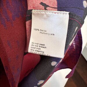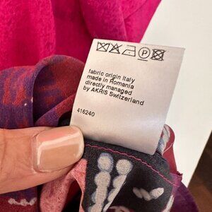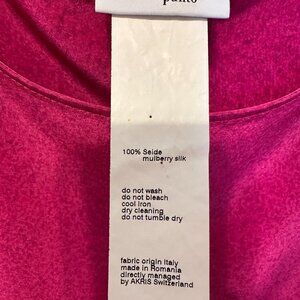 Short sleeved Akris Punto silk top with graphic design along bottom of top. Primary color of top is a pinkish red. Originally purchased at Saks Fifth Avenue.