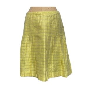 Akris Punto striped pleated high waisted knee length yellow skirt. Size 8. Approximate measurements laying flat are 15” waist and 23” length. 80% Linen and 20 % Silk. In good preowned condition with no noted flaw, but pleats are a little wrinkled.