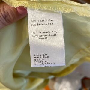 Akris Punto striped pleated high waisted knee length yellow skirt. Size 8. Approximate measurements laying flat are 15” waist and 23” length. 80% Linen and 20 % Silk. In good preowned condition with no noted flaw, but pleats are a little wrinkled.