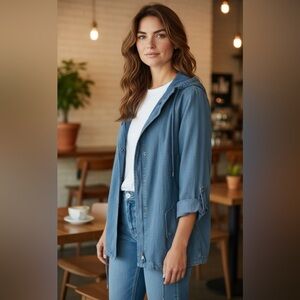 Chic denim blue jacket with a stylish hood. Perfect for casual outings.
