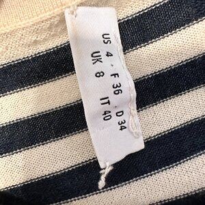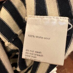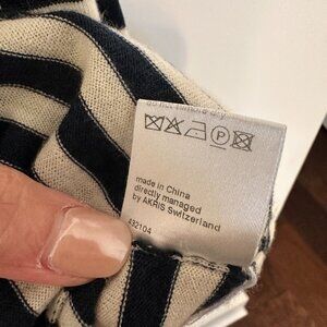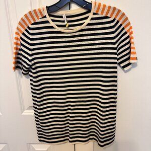 Short sleeved Akris Punto wool top in black and white stripes with accent of orange and white stripes along the shoulders. Originally purchased at Saks Fifth Avenue.