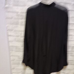Elegant black blouse with sheer shoulder panels. Button-up front. Perfect for a sophisticated look.