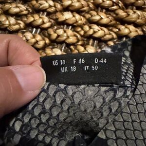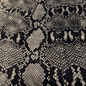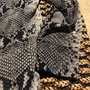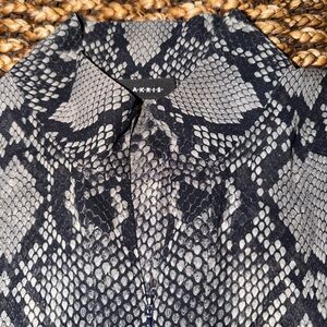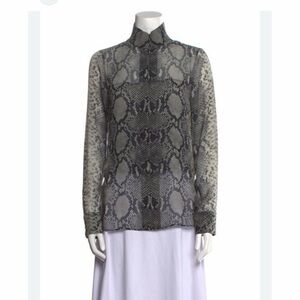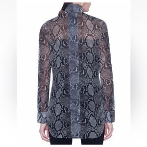 Stylish snakeskin print blouse with long sleeves. Features a mix of gray and black tones.