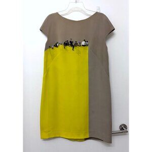 This Akris Maracuja Viewpoint Print Dress is in good condition. Features a yellow and taupe colorblock design with men sitting and watching the Monaco Grand Prix race from the top of the yellow block (spectators print). Silk, cap sleeves (short sleeves), knee length, sheath style, boat neck/ round neck. There are marks on multiple areas. There is darkening on the neckline. There are some slightly faded spots on one front side near the chest/sleeve. Note that the slight vertical lines on the dress are part of the design.