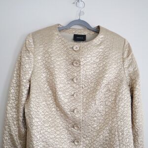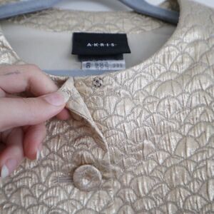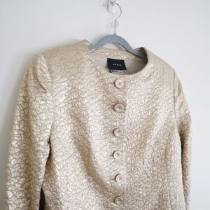 Akris US 10 Gold Lamé Collarless Jacket Button Front Longline