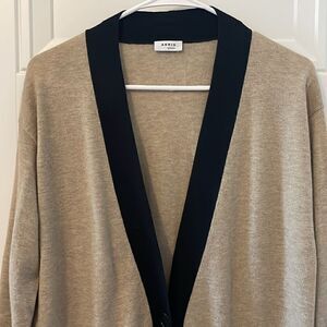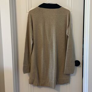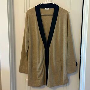 EUC- goes with sleeveless v-neck sweater top, deep v-neck with 5 buttons down the front and 2 front pockets. Tan with black trim, 100% wool, soft and warm.