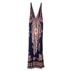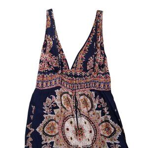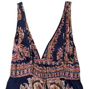 Akualani empire, halter sundress in super soft and silky, almost handkerchief weight Viscose or Rayon, with paisley designs in red, orange, and yellow on navy blue. Marked Medium, but really a Med.-Small. And this dress is really long. (I am 5'5" and measure 36" where the top band hits). This dress is about 6" too long on me--the whole bottom section of the design. And though there is a 3" x 7" shirred elastic section in the back (and a 10" zipper), it is just slightly snug on me. Not uncomfortably so, but if bigger than 36", it will be tight. So, perfect for someone tall and thin.