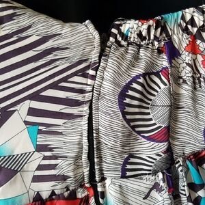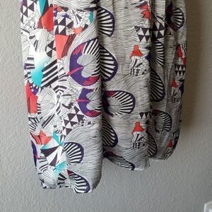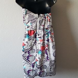This is a fun asymmetrical strapless dress by Akualani with a side zipper and some structure in the bust area. The print is a combo of geometric and tropical print.