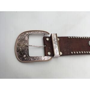 Features embossed floral/paisly design on buckle hardware and circular medalions surrounding belt as well as detailed with studs around top and bottom of belt.