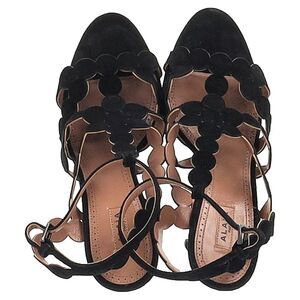 Delivery Duty Paid included – The Alaïa Gladiator Sandal Heels in black suede radiate sculptural elegance, featuring intricate suede straps that artfully wrap the ankle and calf for a commanding, architectural silhouette. With a bold block heel, they combine runway-worthy drama with walkable comfort—perfect for standing out without sacrificing poise. Style them with a sleek mini dress or tailored shorts and a structured blazer to balance the detailed sandals with clean, modern lines.