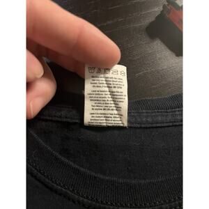 Pre-owned with notable wear — small hole under arm and bleach spots on sleeve (see photos). Fabric is soft from wash and wear; graphics remain bright and clear.