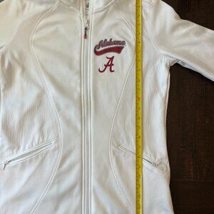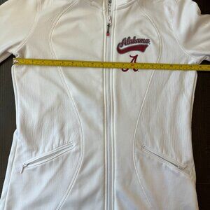 This Alabama Crimson Tide women’s jacket is a size Medium and features a clean white design with the classic embroidered “Alabama A” logo and script lettering on the chest. It’s made from a lightweight, breathable fabric and includes a full front zipper and zippered side pockets for convenience. The jacket is in excellent condition, with no wear, no tears, and no stains. Color may vary slightly based on lighting.