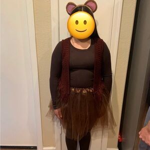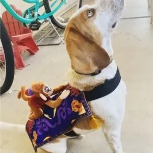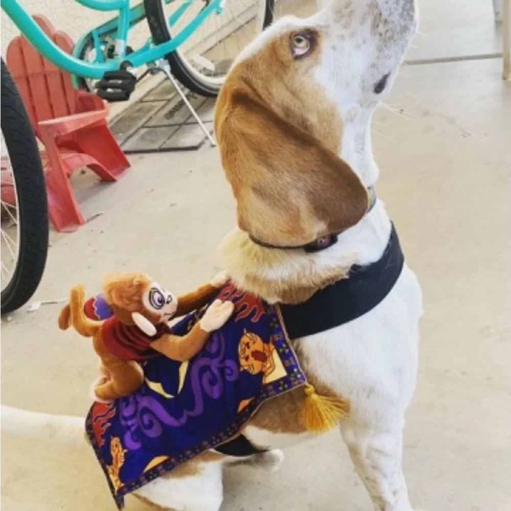 Dress your dog in this fun costume featuring a playful monkey and a vibrant carpet design. Perfect for adding a touch of whimsy to your pet's wardrobe.