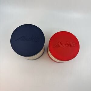 Very Gently Used vintage condition. Nice set of vintage Aladdin small, insulated thermos's can be used for hot or cold food. These thermoses would be great for soup or if you want something to stay cold just place the lid in the freezer overnight and it will keep your food or drink cold.