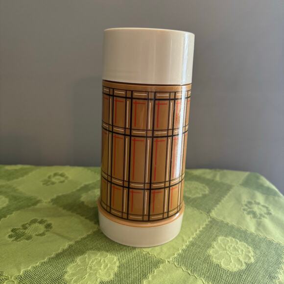 Explore the nostalgia of the Vintage Aladdin Best Buy Thermos Bottle, a classic addition to your collection. Wrapped in a timeless brown plaid design, this wide-mouthed Thermos, model number WM4020, is crafted from durable plastic, ensuring both style and longevity. Proudly made in the United States, this piece remains unmodified, preserving its authentic charm. Whether used for your daily commute or displayed as part of a vintage collection, this Thermos bottle is a testament to the enduring appeal of retro aesthetics
