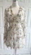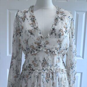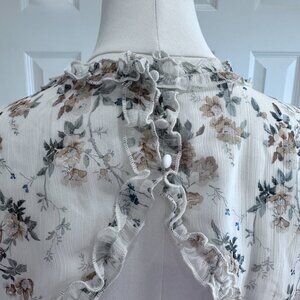 ***Lightweight Boho, comfortable Mini to midi depending on how tall you are, dress with a lite slip(no-see through). Caramel and blue shade flowers on white background. Coquette Girl, long puffy sleeves (elastic finish) with a raffles all over the dress. Light weight, feminine and delicate design. Overhead dressing - back zipper, braless look. Features open back with 3 buttons to close the top.