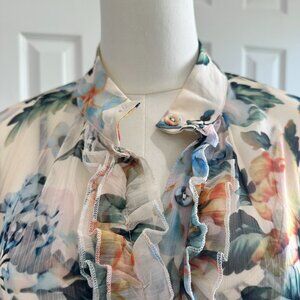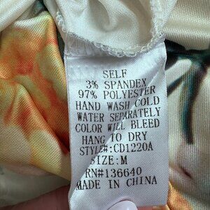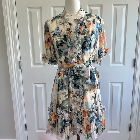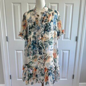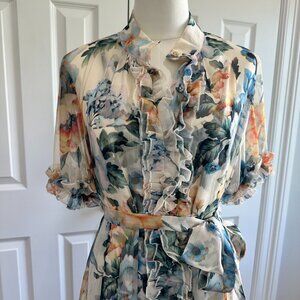 Stunning and romantic floral mini dress by Aladore. This piece features an exquisite, multicolored watercolor floral print with beautiful shades of cream/ivory, blue, teal, yellow, and orange/coral.