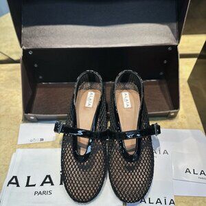 These Alaia flats feature a sophisticated black mesh overlay with a diamond texture, complemented by a solid black strap and a rounded toe design. The flat sole ensures comfort, while the unique mesh pattern adds a contemporary touch to the classic Mary Jane style. Perfect for both casual and dressy occasions, these shoes offer a blend of elegance and modern flair.